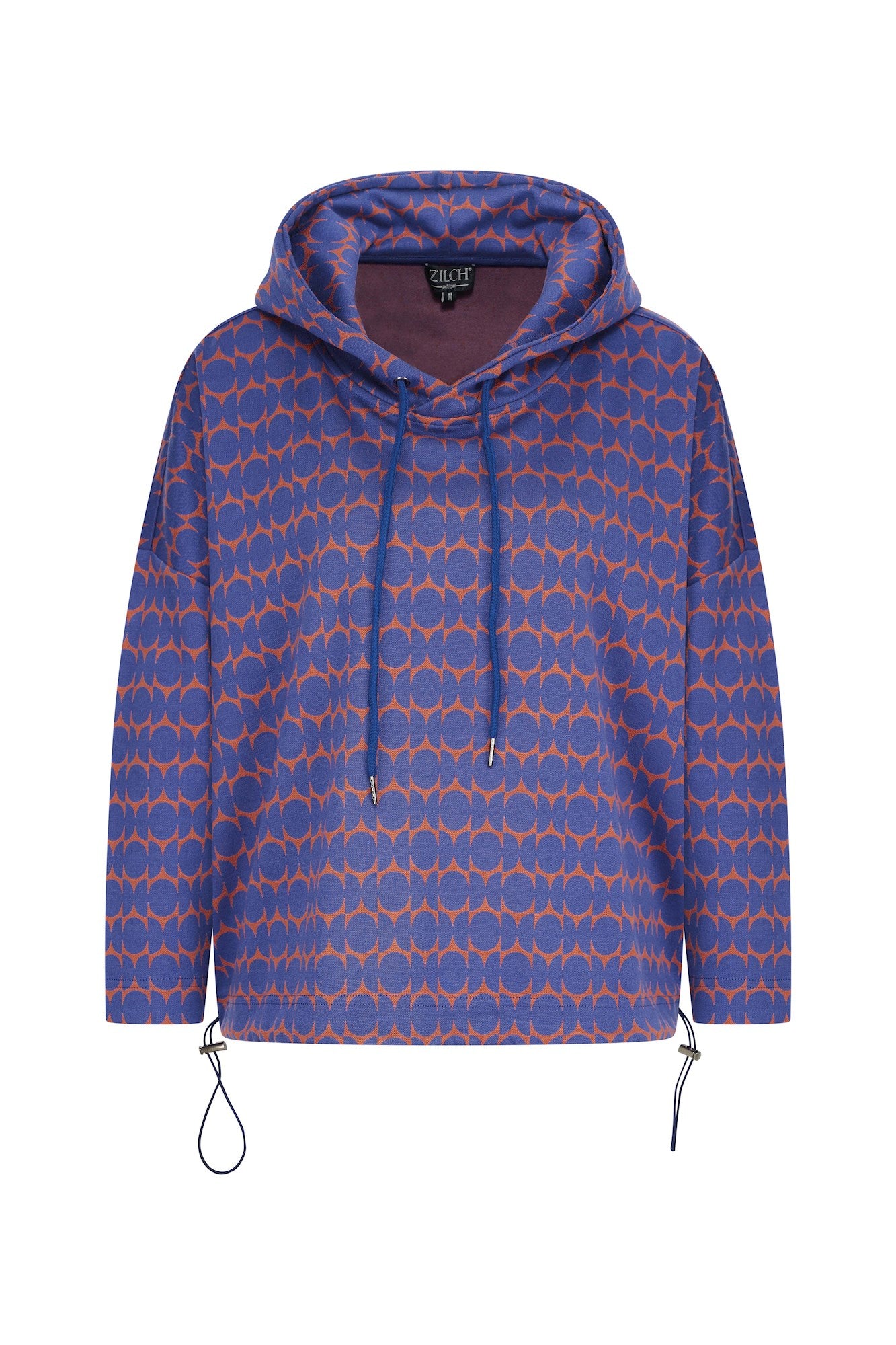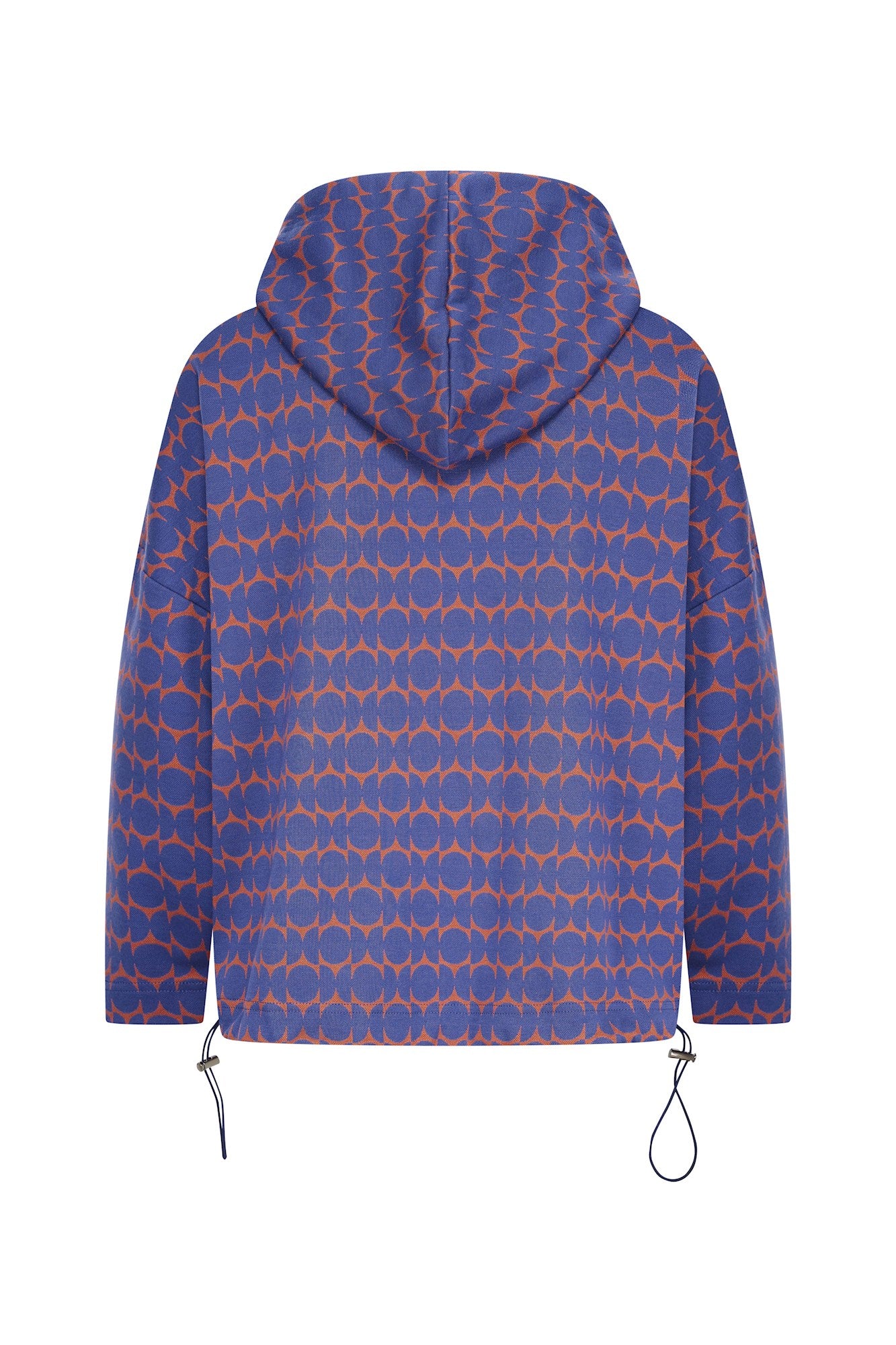 Locker sitzender Pullover mit überschnittenen Schultern und Kapuze aus weichem Jacquard-Strick mit grafischem Zweifarbenmuster. Sowohl der Bund als auch die Kapuze sind mit einem Kordelzug für eine optimale Passform versehen. Kombinieren Sie ihn mit einer passenden einfarbigen oder gemusterten Hose für ein trendiges und bequemes Winteroutfit.