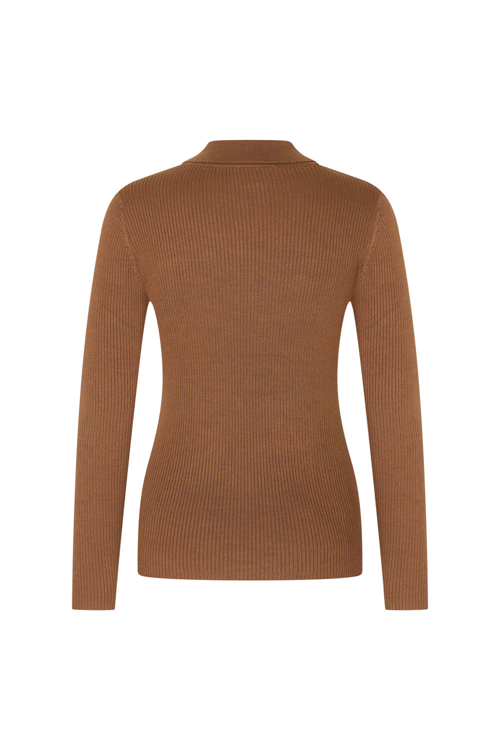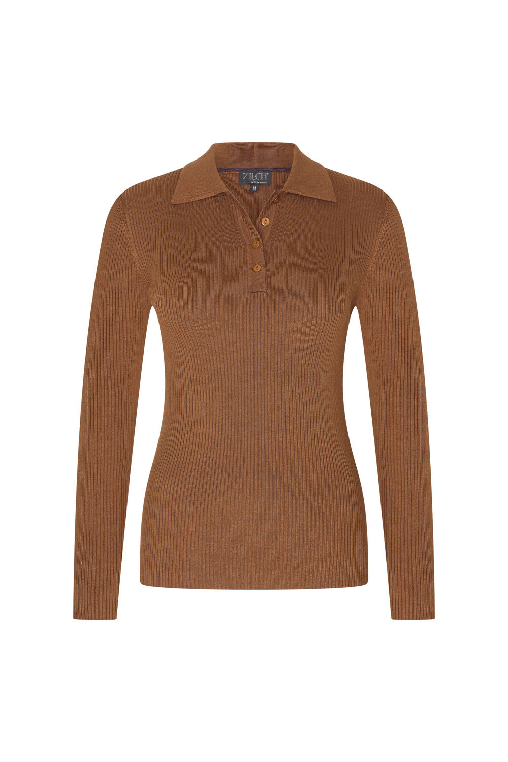 Ein figurbetontes, geripptes Stricktop mit Polokragen und Knopfleiste aus wunderbar weicher Bambusviskose in wunderschönen Herbstfarben. Das Top hat lange Ärmel und passt perfekt zu einem bedruckten Rock oder einer Hose.