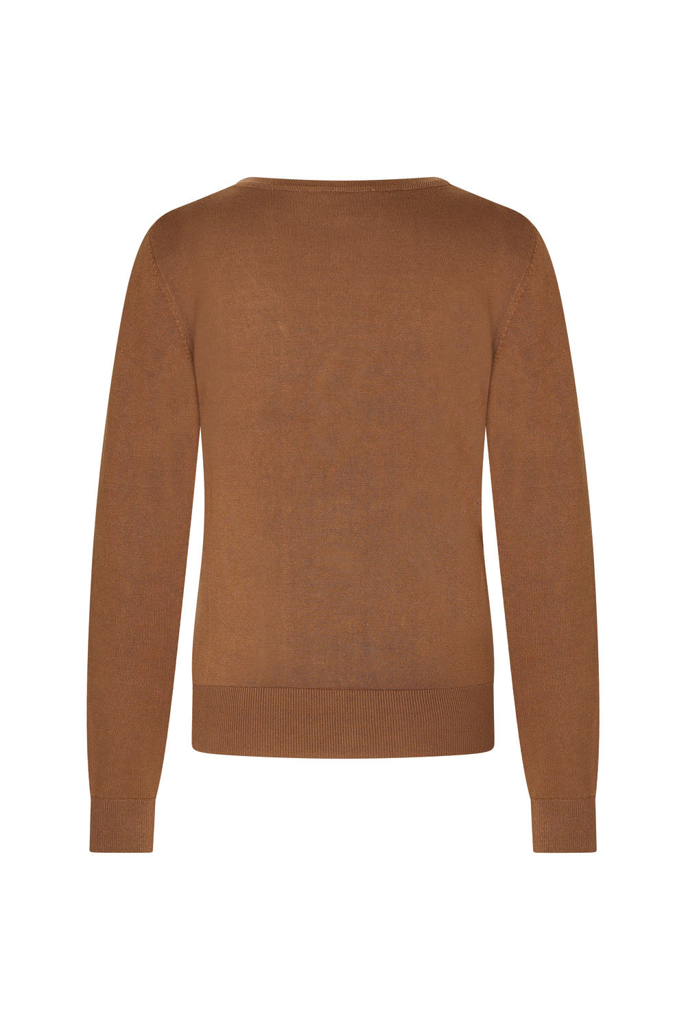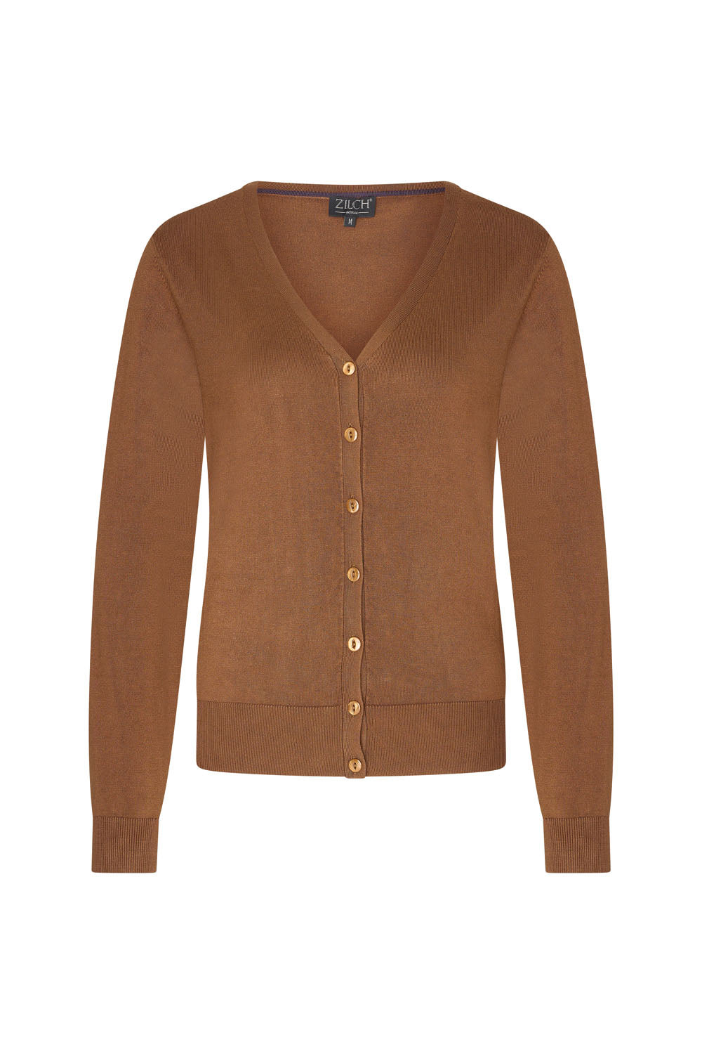 Wunderschöne, schlichte Strickjacke aus Viskose und Bambus mit V-Ausschnitt und langen Ärmeln in schönen Herbstfarben. Die Strickjacke hat einen Knopfverschluss sowie breite Rippbündchen an Ärmeln und Saum.