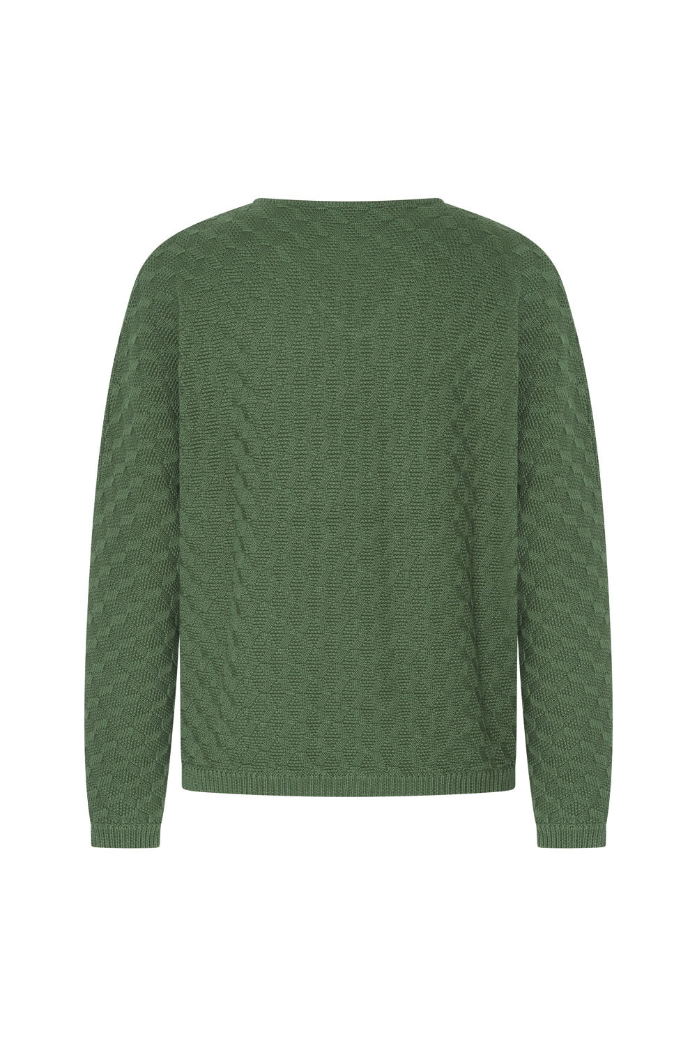 Weicher, gestrickter V-Ausschnitt-Pullover aus Bio-Baumwolle. Dieser bequeme Pullover besticht durch sein luxuriöses, strukturiertes Strickmuster und die dezenten Fledermausärmel. Kombinieren Sie ihn mit einem Rollkragenpullover oder einer Bluse für ein warmes und stilvolles Herbstoutfit.