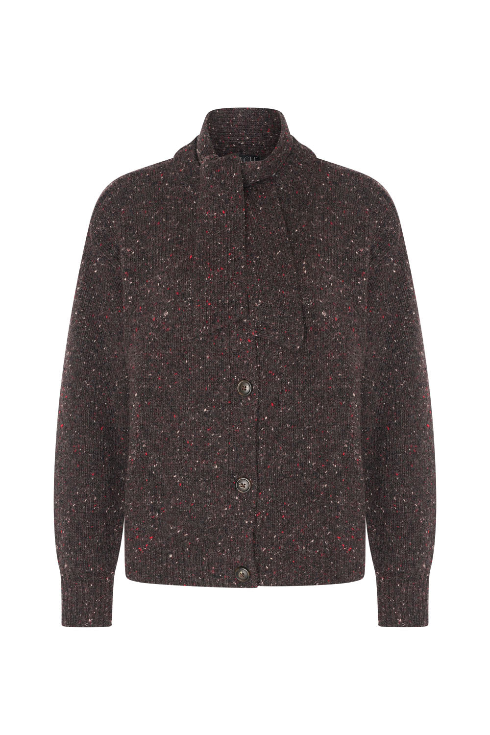 Warme Strickjacke mit Rundhalsausschnitt und lockeren Bändern zum Binden wie ein Schal. Die Strickjacke besticht durch auffällige Knöpfe und ist aus einer zertifizierten Merino-Alpaka-Mischung gefertigt. Das Strickmuster ist mit kleinen Farbtupfern versehen und in einer Vielzahl herbstlicher Farben erhältlich, die sich wunderbar kombinieren lassen.