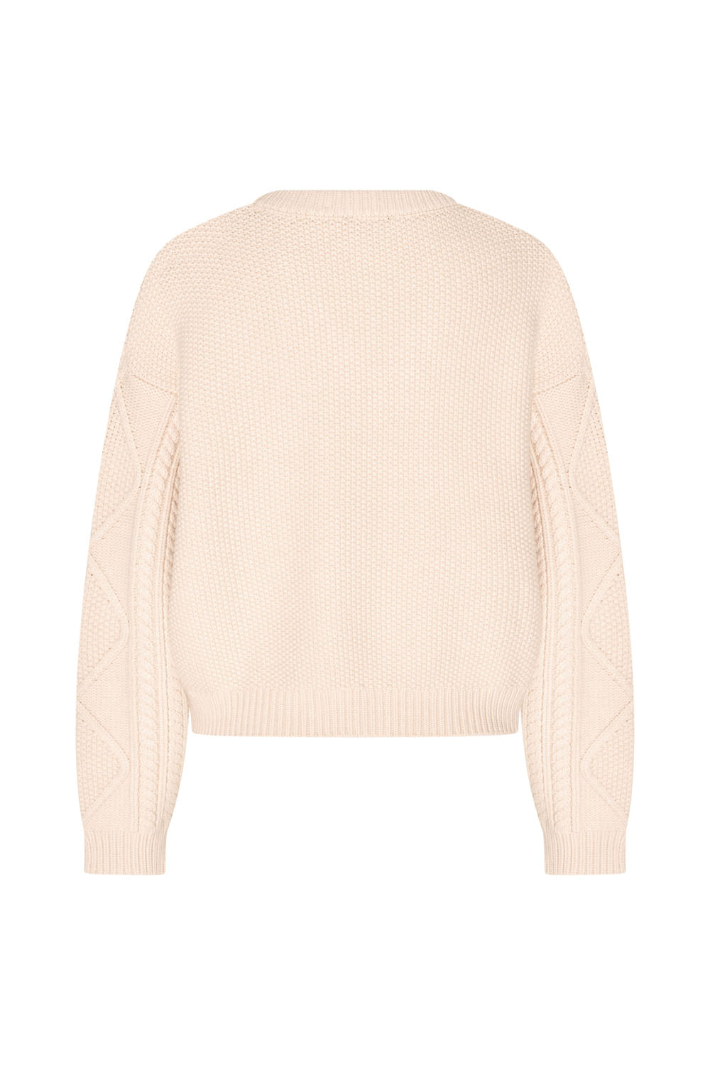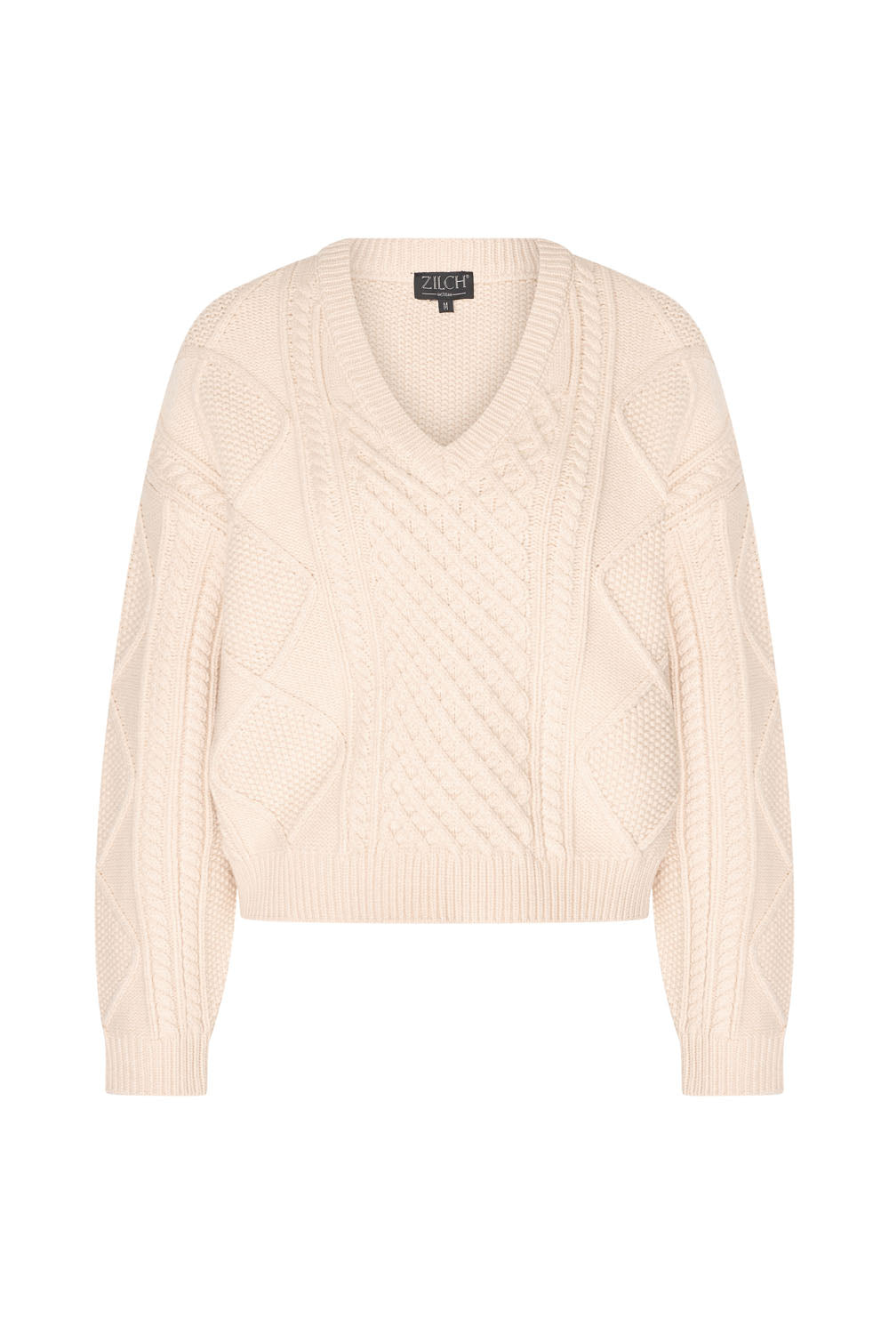 Ein modischer, kurzer Pullover in einem eleganten Zopfmuster in zwei neutralen Farben. Der Pullover hat einen V-Ausschnitt und leicht locker sitzende Ärmel mit schmalen Bündchen. Kombinieren Sie ihn mit einer hochgeschnittenen Hose und einer Bluse für ein modernes Winteroutfit.