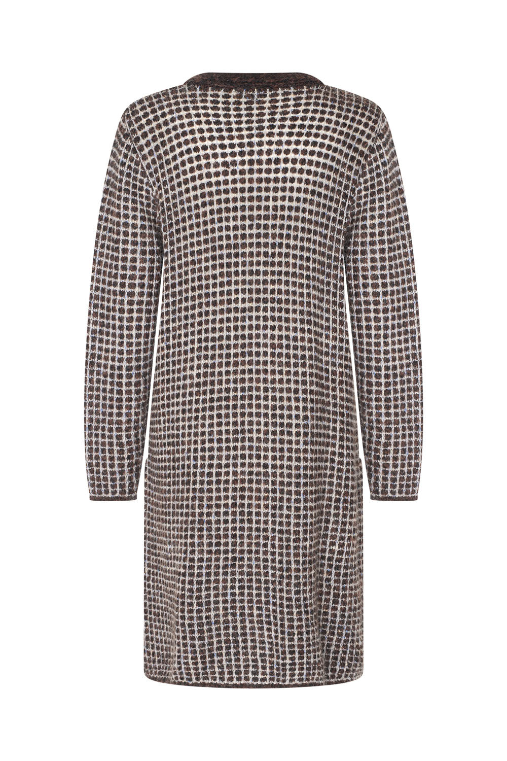 Wunderbar warme, lange Strickjacke in grobem, leicht offenem Strickmuster aus einem weichen Wollmischgewebe in Braun und Grau mit leuchtend blauen Akzenten. Die Strickjacke hat einen V-Ausschnitt, Taschen, einen Knopfverschluss und reicht bei einer Körpergröße von 169 cm bis zum Knie.