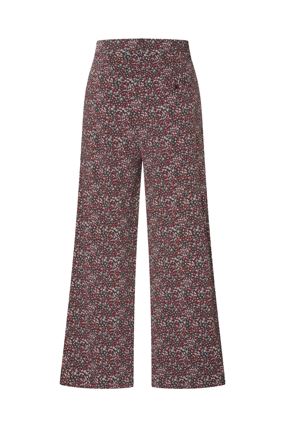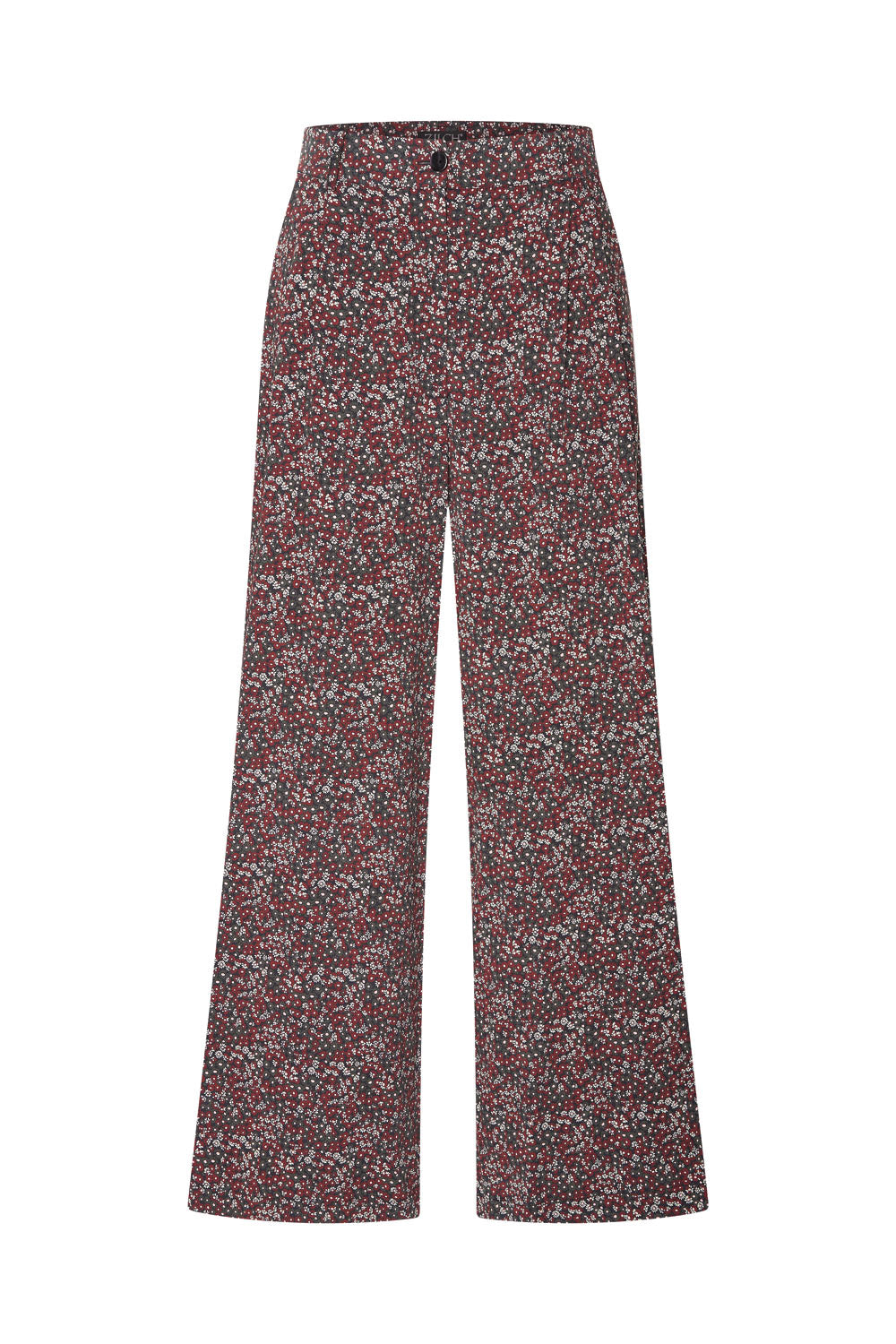 Gerade geschnittene Hose mit weitem Bein und Bundfalten. Gefertigt aus weicher Viskose mit Stretchanteil in zwei wunderschönen Wintermustern, verfügt sie über zwei Eingrifftaschen vorne und eine Leistentasche mit Knopf hinten.