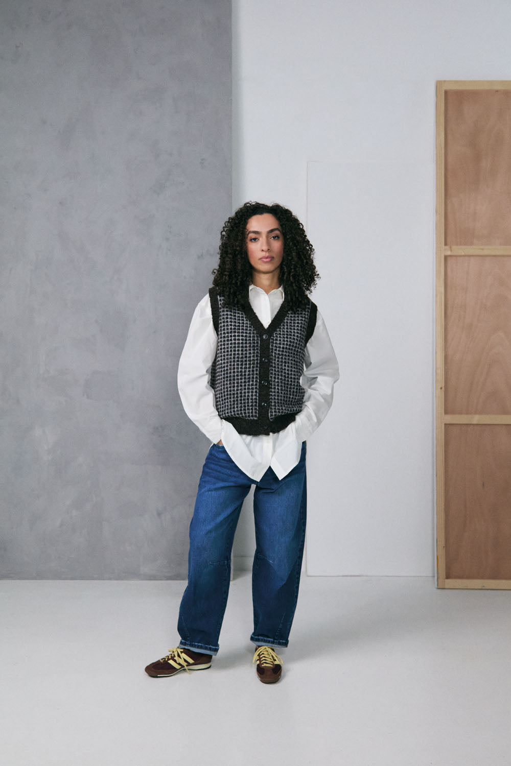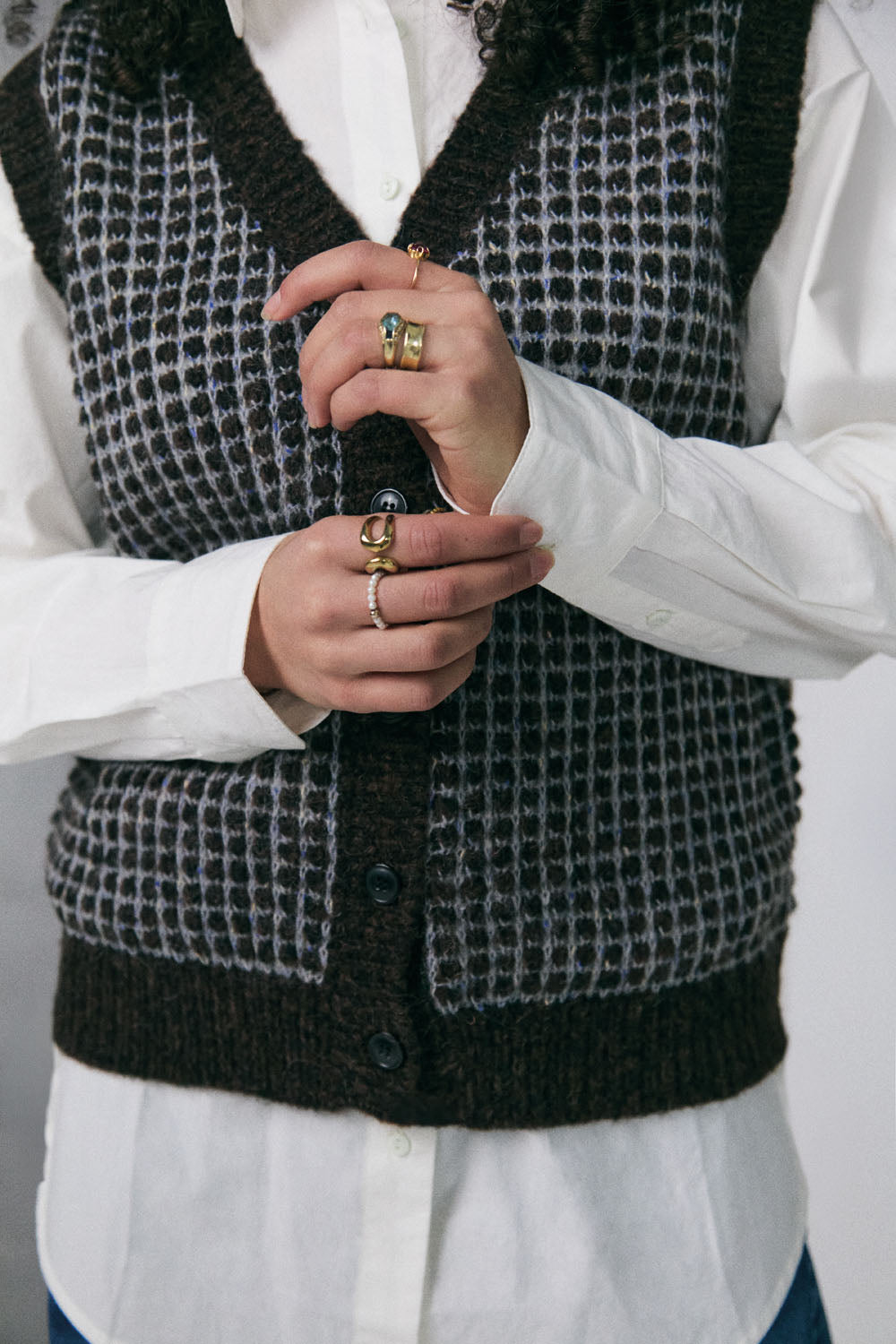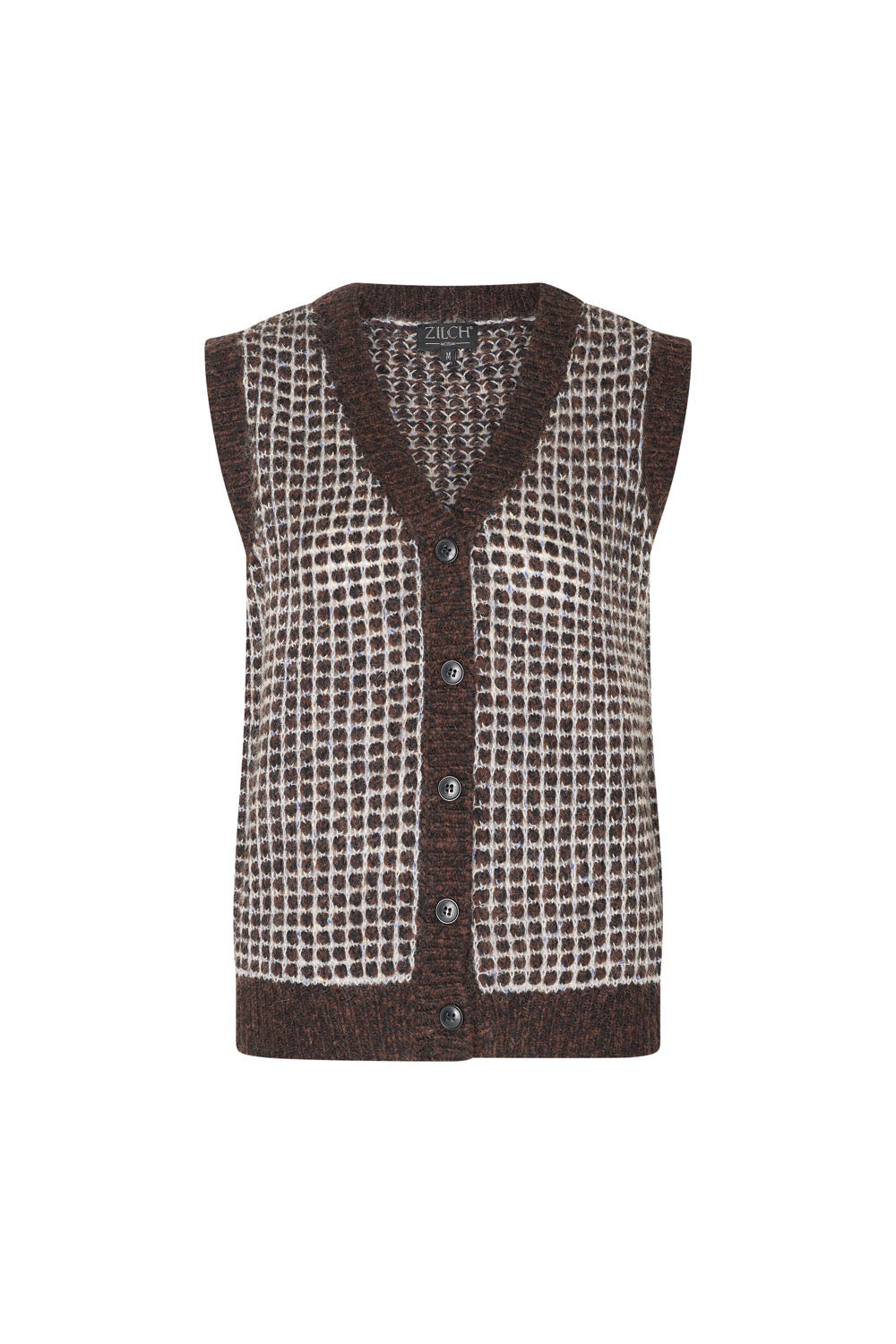 Trendige, ärmellose Strickjacke mit V-Ausschnitt und Knöpfen. Gefertigt aus einem wunderbar weichen Strickmaterial mit dezentem Lochmuster in Dunkelbraun und Grau mit leuchtend blauen Akzenten, ist diese warme Strickjacke aus Wollmischung ein stilvolles Winteroutfit. Tragen Sie sie über einer weißen Bluse.