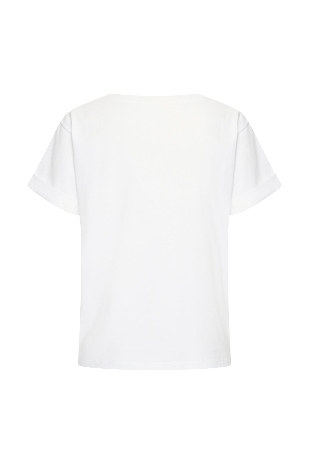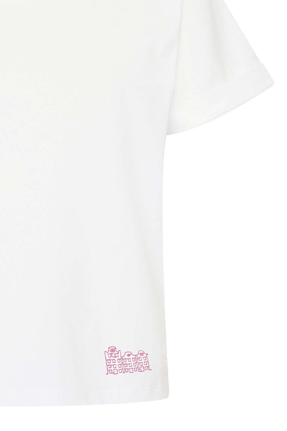 Ein robustes Baumwoll-T-Shirt mit kastenförmigem Schnitt und hochgekrempelten Ärmeln. Das weiße T-Shirt hat einen Rundhalsausschnitt und ist links mit einer zartrosa Stickerei von Amsterdamer Häusern verziert.